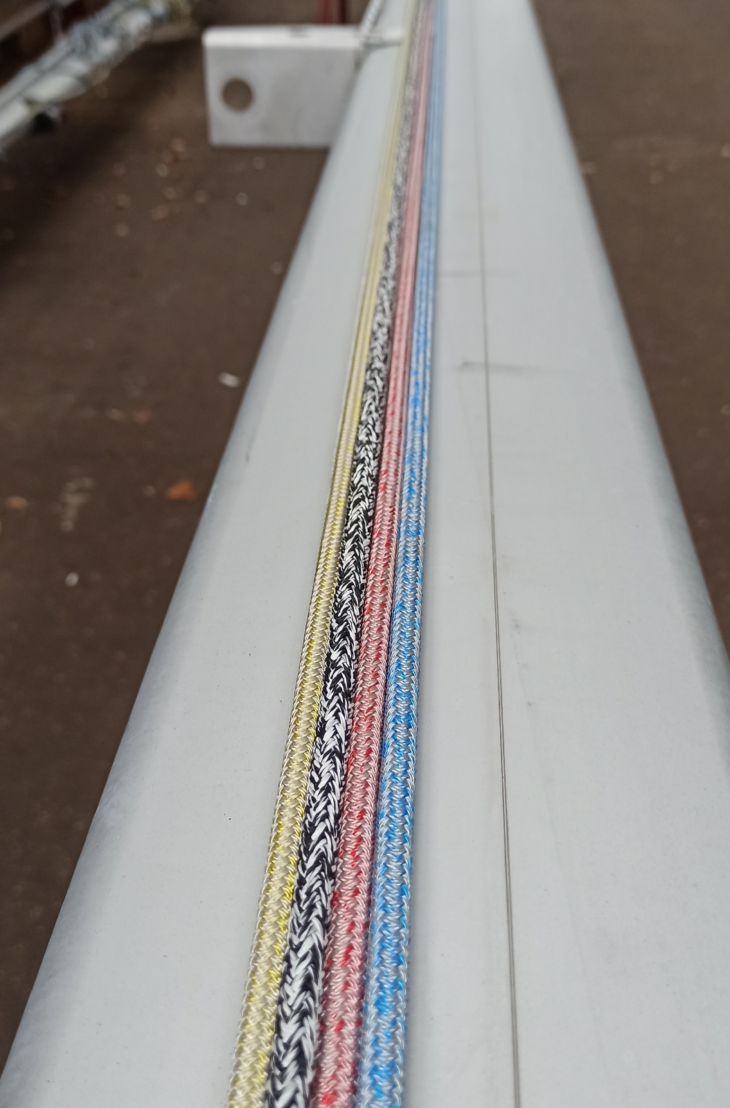 Außerdem hatte ich nach der Saison sämtliche Draht-Tauwerke aus dem Mast gezogen und  dabei gleich dünne Schnüre eingezogen. Jetzt konnte ich an diesen Pilotleinen das neue Dyneema-Tauwerk anknüpfen und durch den Mast einziehen. Es handelt sich dabei um Gleistein Race XP.